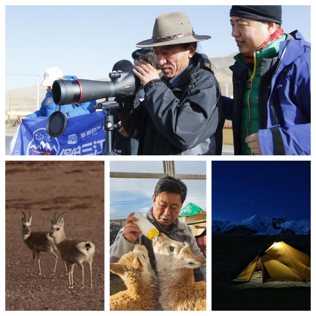 沿途影像记录:上方为隆宝自然保护区的工作人员在试用单筒望远镜观鸟;下方,左为野生藏羚羊,中为索南达杰保护站的工作人员悉心照料小藏羚羊,右为夜色中的三江源