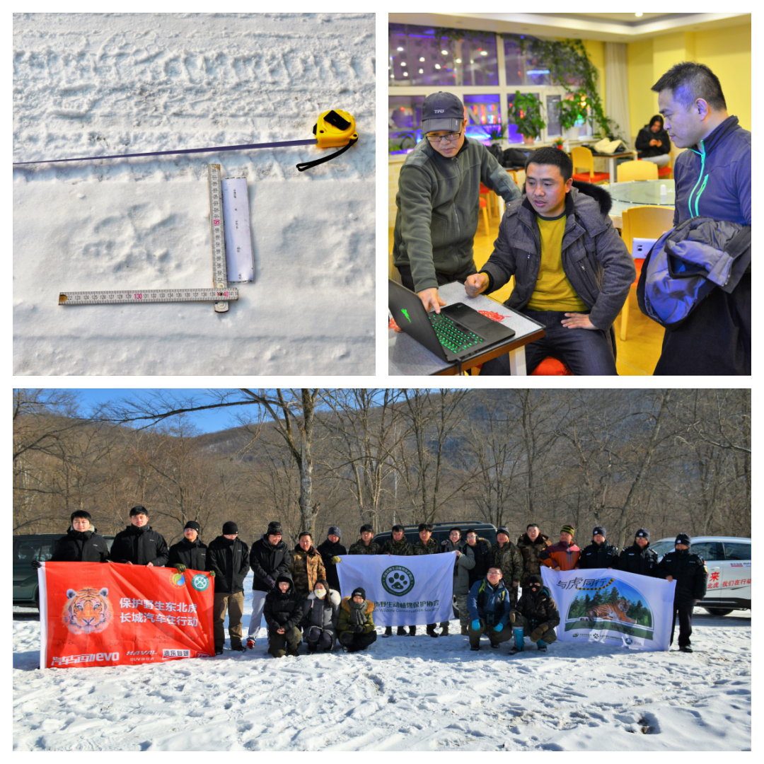 活动花絮:上层左图为现场测量虎爪印记判断虎龄等相关信息,右图为白天行动结束后在驻地做活动总结,下图为团队合影。