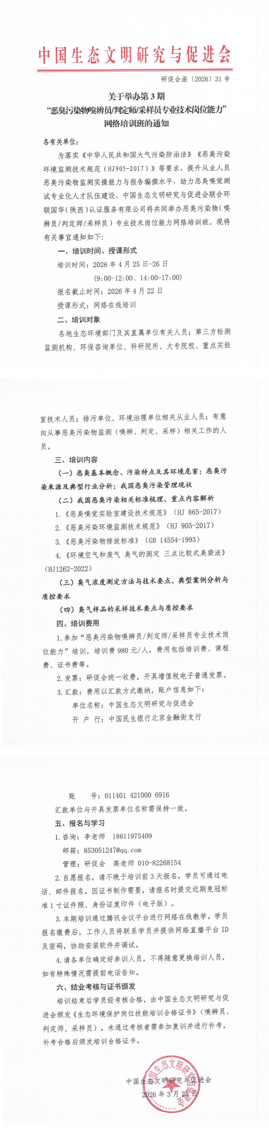 培训通知:关于举办第3期恶臭污染物嗅辨员、判定师、采样员专业技术岗位能力网络培训班的通知
