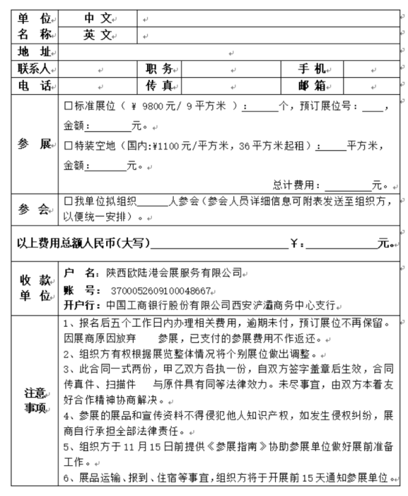 (二)特装空地租赁费:1100元/平方米,空地规格为36、72、130、150、180、225、300、500平方米,特装搭建及施工费用自理。
