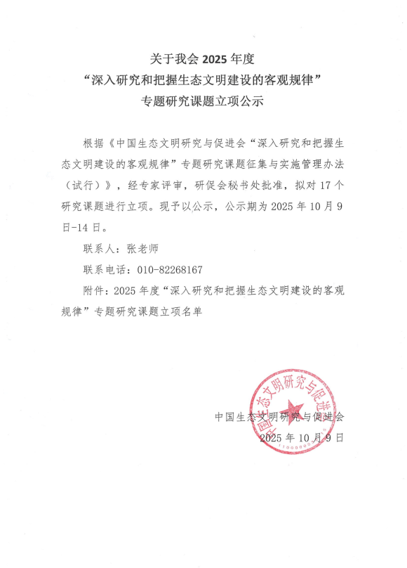 关于我会2025年度“深入研究和把握生态文明建设的客观规律”专题研究课题立项公示