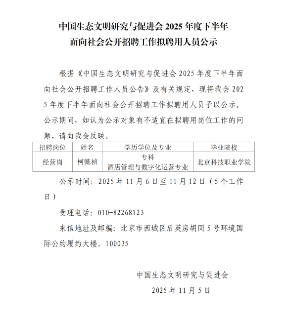 中国生态文明研究与促进会关于开展2025年度下半年面向社会公开招聘工作的公示