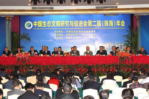 中国生态文明研究与促进会第二届(珠海)年会12月1日在广东省珠海市召开。中国生态文明研究与促进会总顾问、中共中央原政治局委员、国务院原副总理、九届全国人大常委会副委员长姜春云为会议发来致辞。中国生态文明研究与促进会会长、十一届全国政协副主席、农工党中央常务副主席陈宗兴出席会议并作总结讲话。中国生态文明研究与促进会顾问、环境保护部部长周生贤出席会议并作主旨演讲。