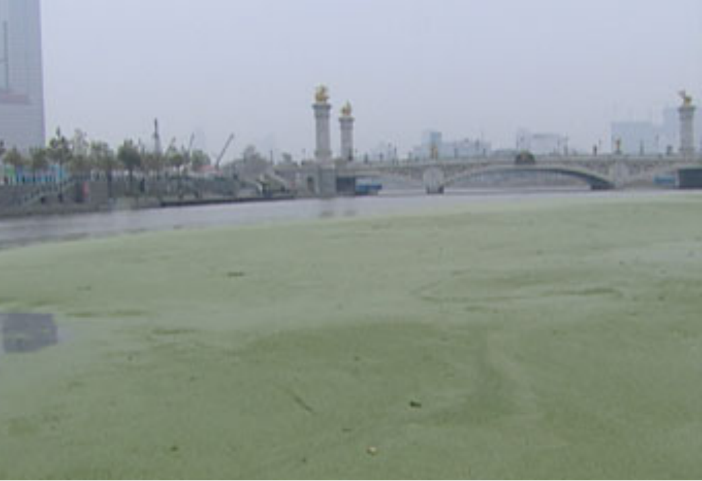 曾经的海河北安桥下铺满浮萍、水体浑浊 |