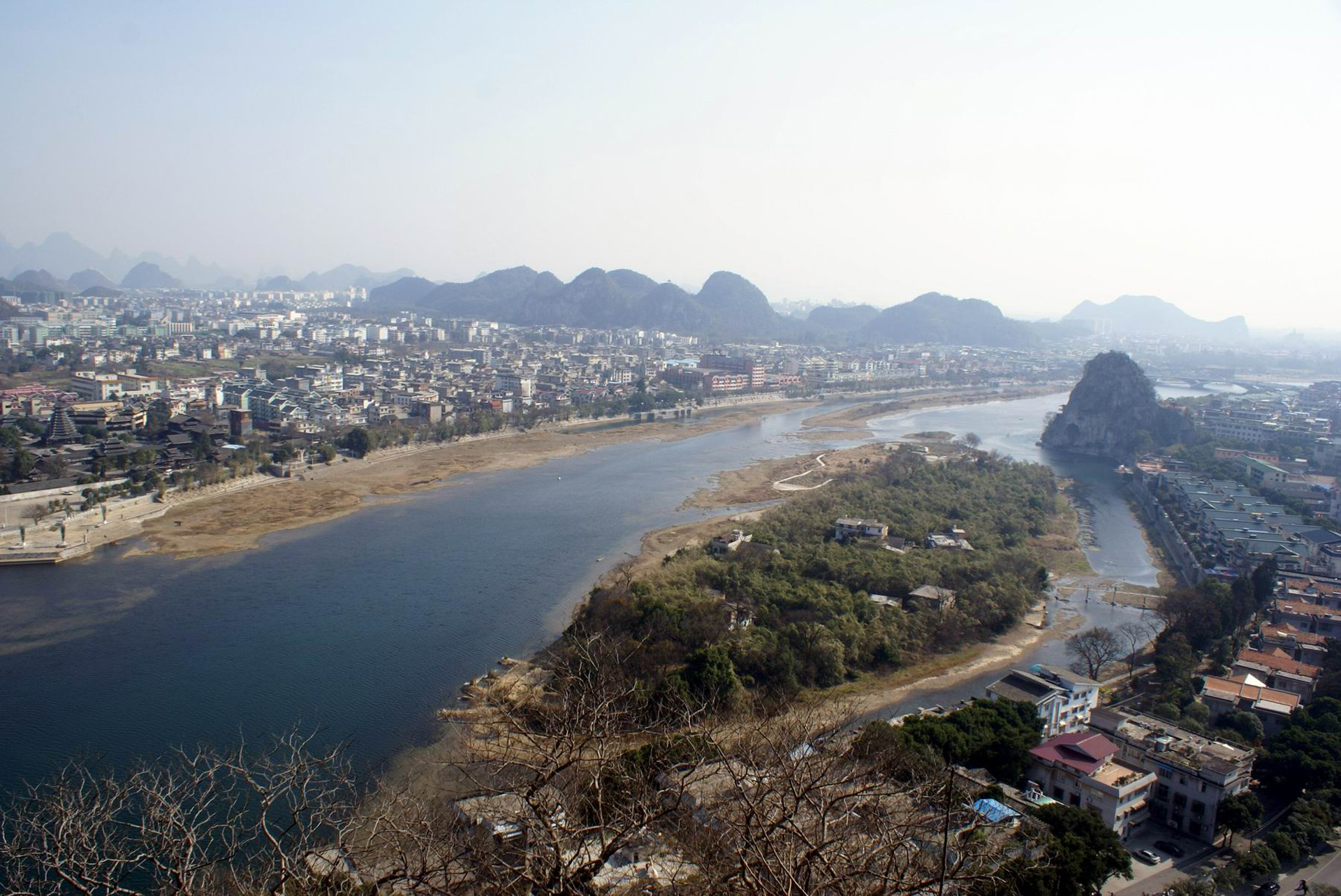 漓江发源于桂林市兴安县西北部的越城岭主峰猫儿山(海拔2141.5m),自北向南流,属珠江流域西江水系,地处东经110°05′-110°40′,北纬25°15′-25°55′。漓江干流流经兴安、灵川、桂林、阳朔、平乐等市县,全长214km,平乐县城以下的河段称为桂江,全流域范围包括兴安、灵川、桂林、临桂、阳朔、荔浦、恭城等市县,流域总面积12285km2。漓江自北向南穿过桂林市城区,流经桂林市区长49.3km。