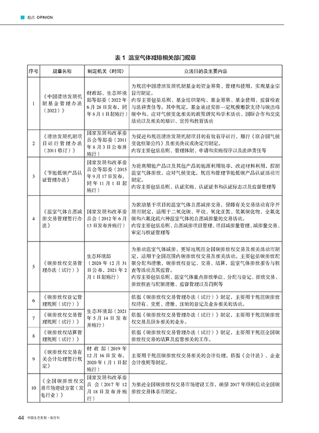 法规,仅有零星出台的规范性文件,如生态环境部等五部委出台的《关于促进应对气候变化投融资的指导意见》。自中国提出“双碳”目标后,国务院有关部门在各自领域发布了诸多规范性文件,如财政部发布的《财政支持做好碳达峰碳中和工作的意见》、国务院国有资产监督管理委员会发布的《关于推进中央企业高质量发展做好碳达峰碳中和工作的指导意见》等。