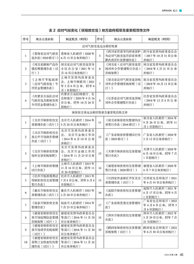 在地方层面,不少地方政府出台了本地区应对气候变化相关的地方政府规章及规范性文件(见表 2)。石家庄市出台了《石家庄市低碳发展促进条例》(2016), 是全国第一部专门规范城市低碳发展的地方性立法。围绕“双碳”目标,江苏省人大(含常委会)发布《关于推进碳达峰碳中和的决定》(2022),天津市人大(含常委会)发布《天津市碳达峰碳中和促进条例》(2021)。 早期开展碳排放权交易试点的北京、上海、天津、重庆、广东和湖北,以及参与碳排放权交易的四川、福建等地区几乎都发布了碳排放权交易相关的地方政府规章或规范性文件。